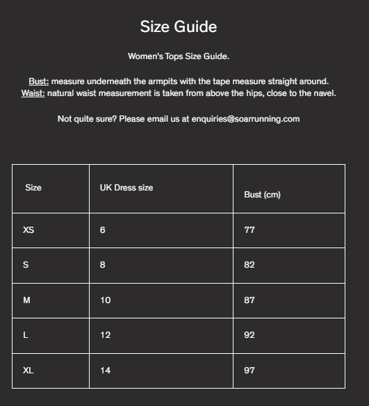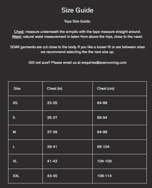 Different Male and Female cuts can be viewed on the Soar website. Pictures below include Soar singlet mens and womens sizing charts, example Soar singlets worn by members: